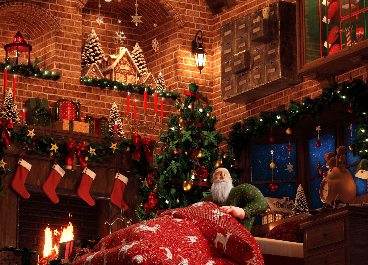 Inside the cozy chimney, warmed by the glow of the fireplace, Santa awakens with a start at the sound of a reindeer alarm and gently floats into the air as he begins preparing for work.