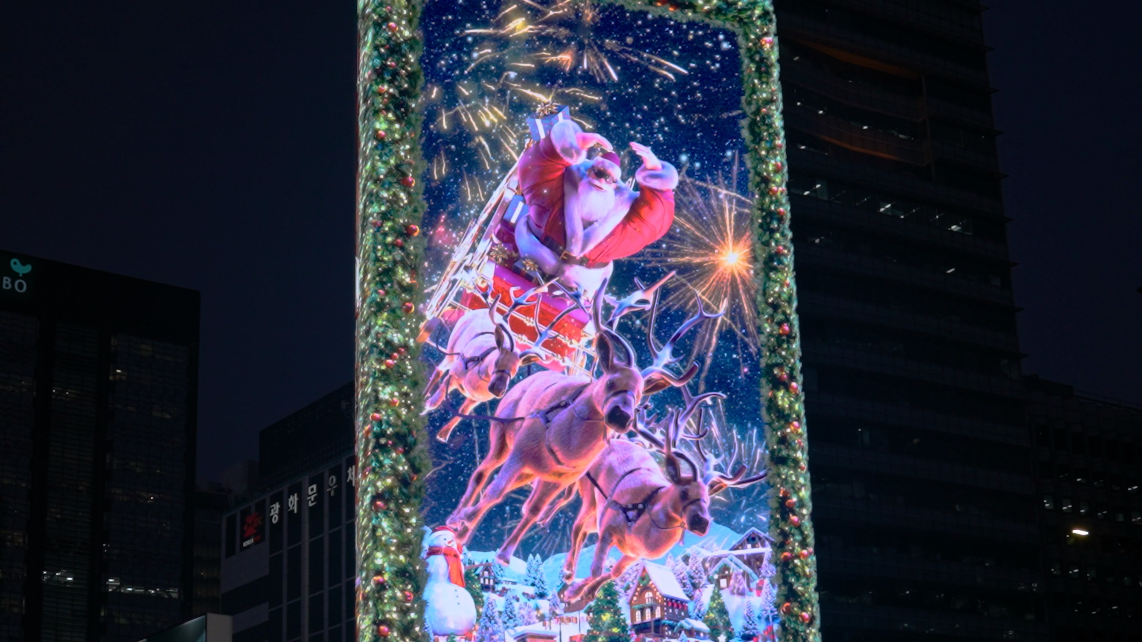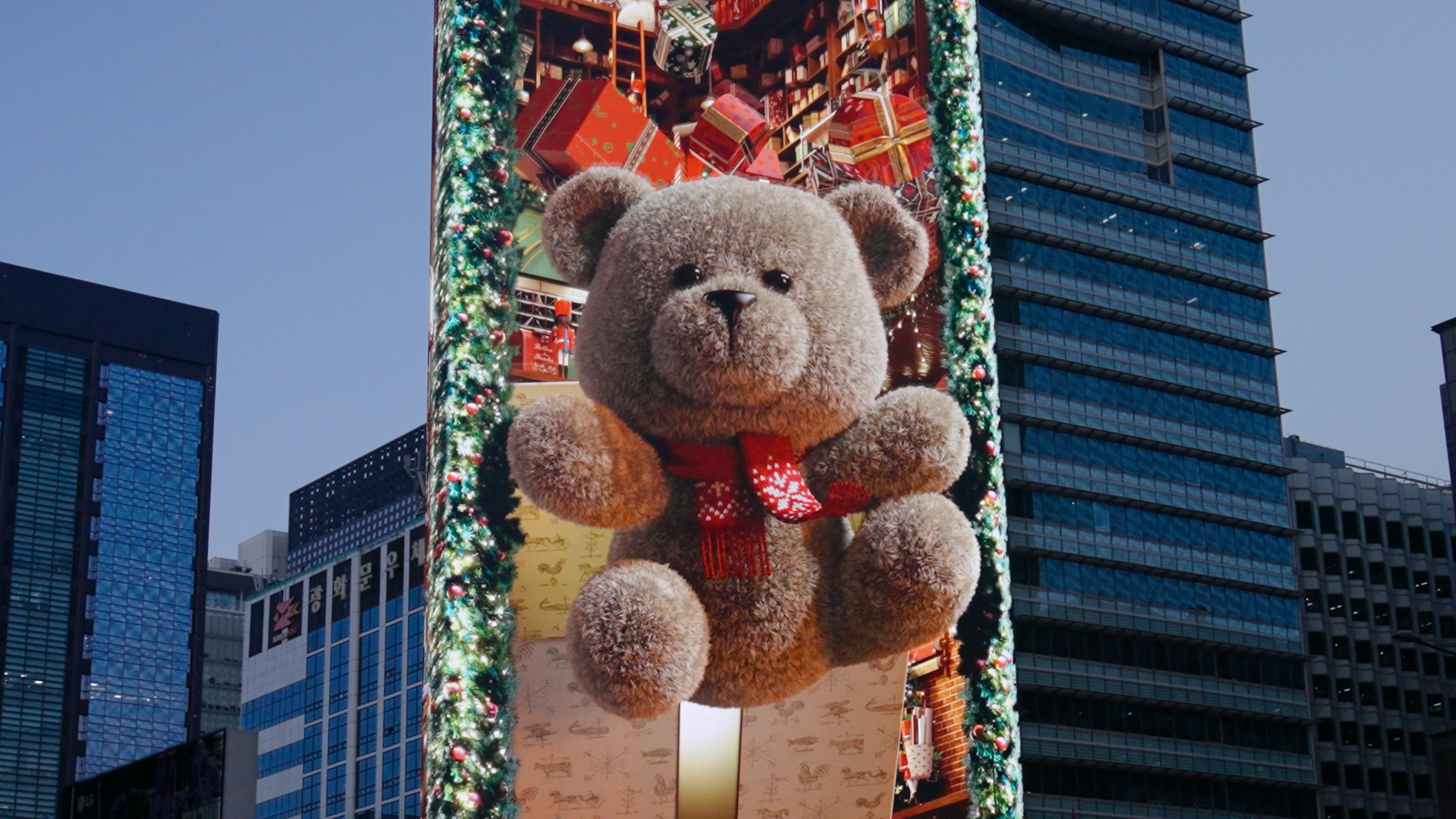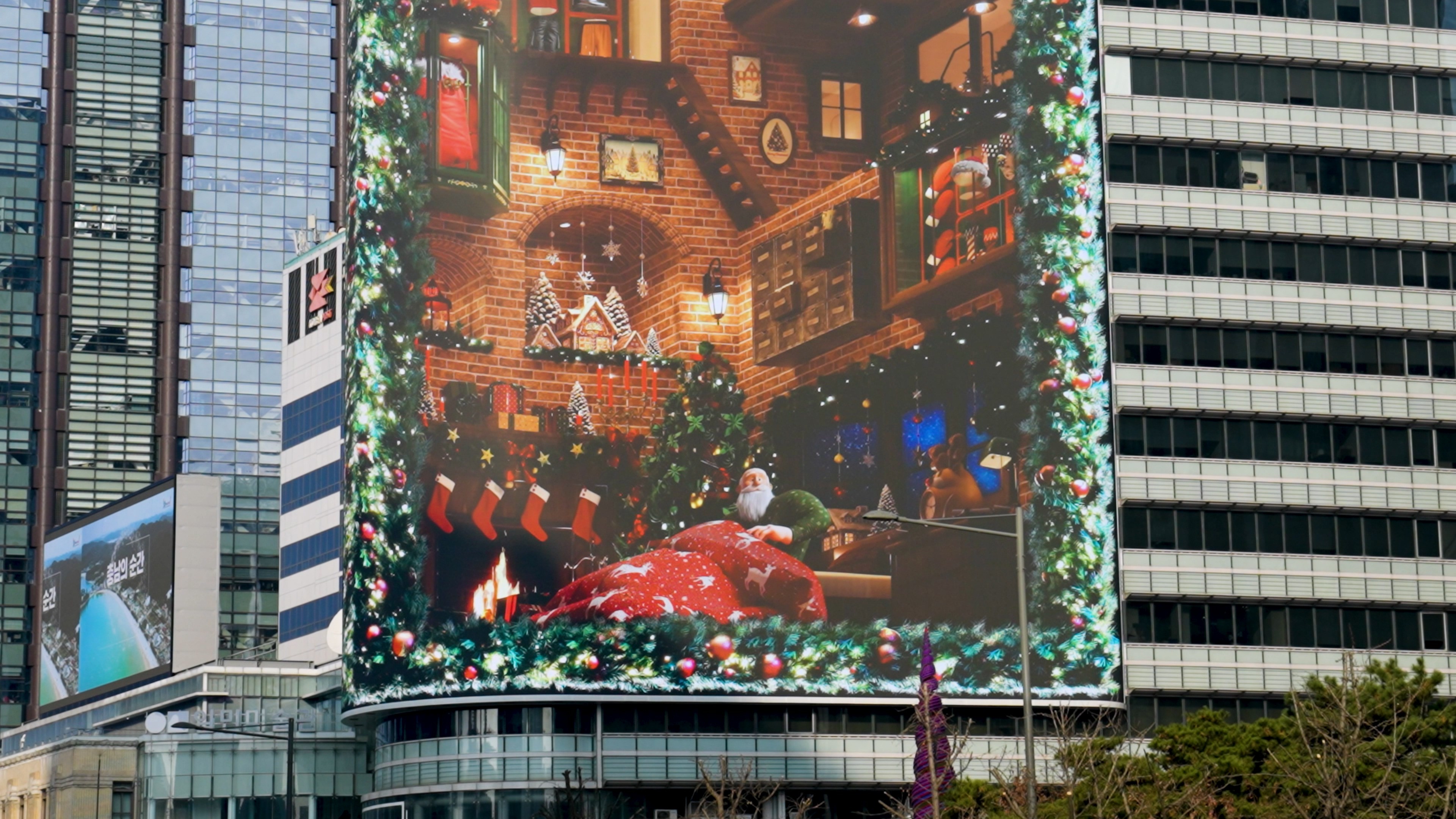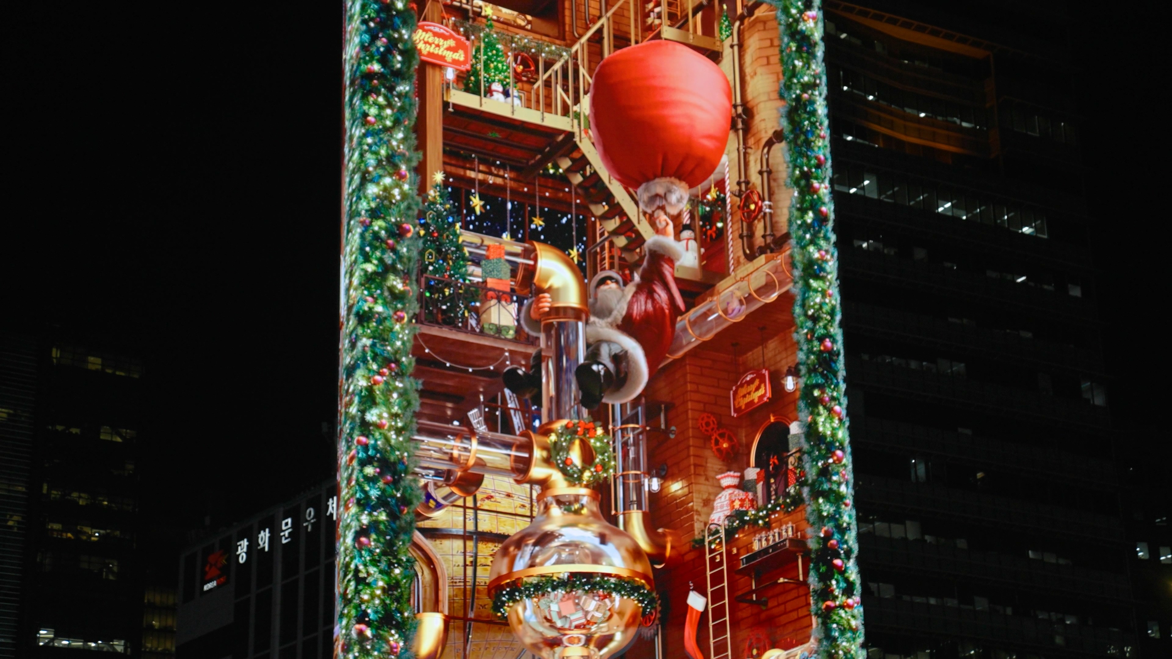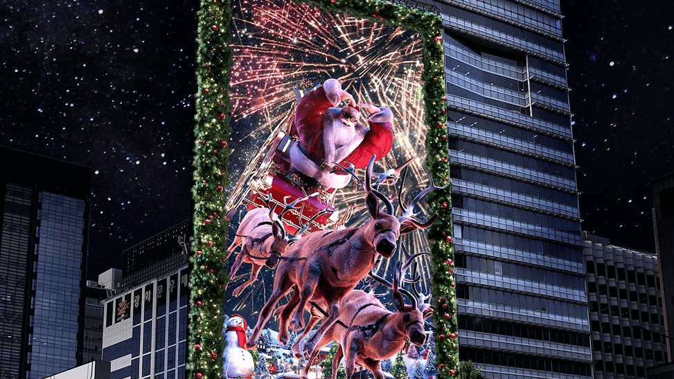 Additionally, by utilizing the curved structure of the media facade, the main display presents Santa’s commute, while a separate side display on the rear loops the process of gifts being wrapped—connecting seamlessly to Santa’s world. Through this dual-screen composition, the entire building is transformed into a stage, expanding the narrative universe and creating an immersive storytelling experience.