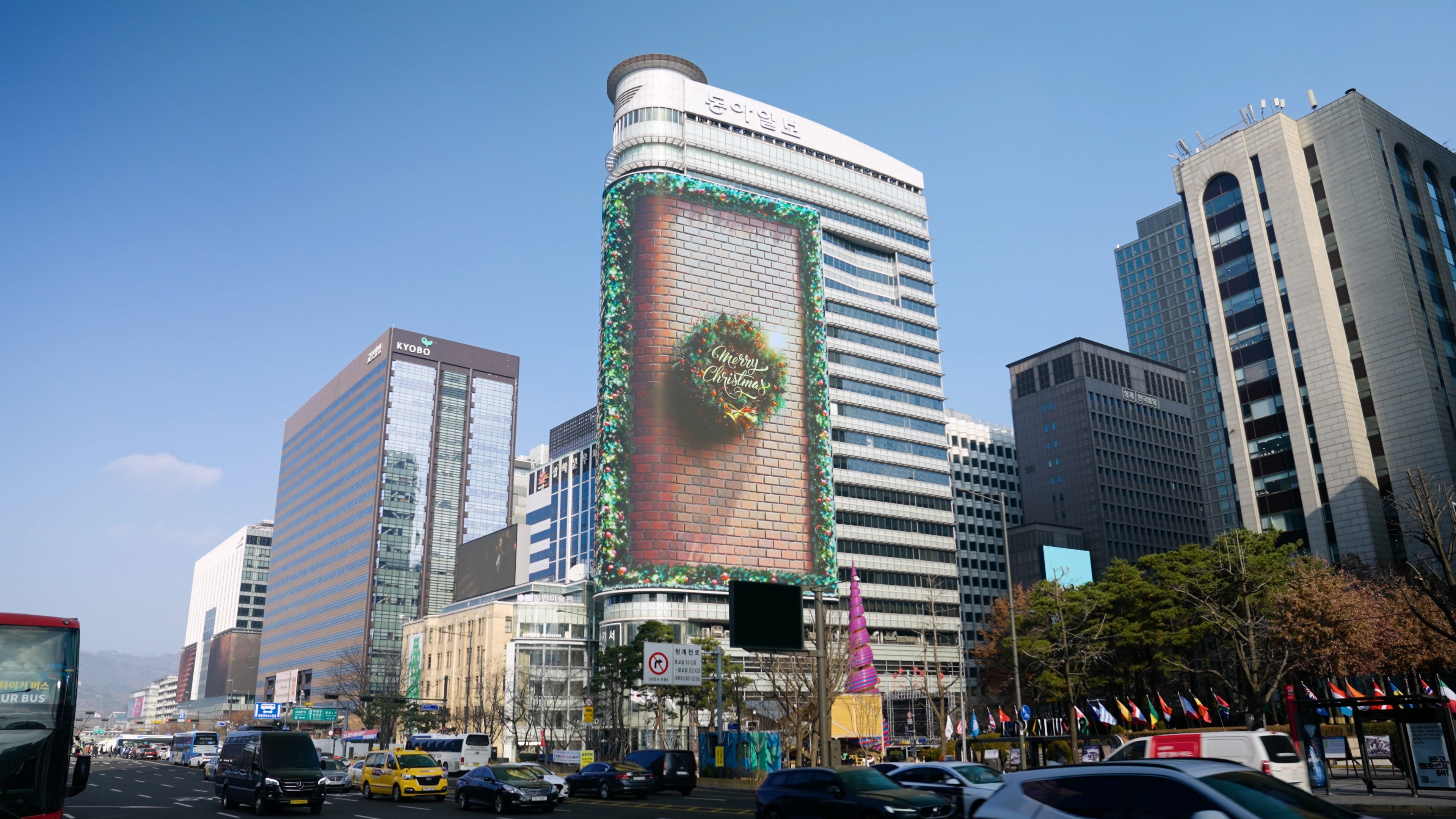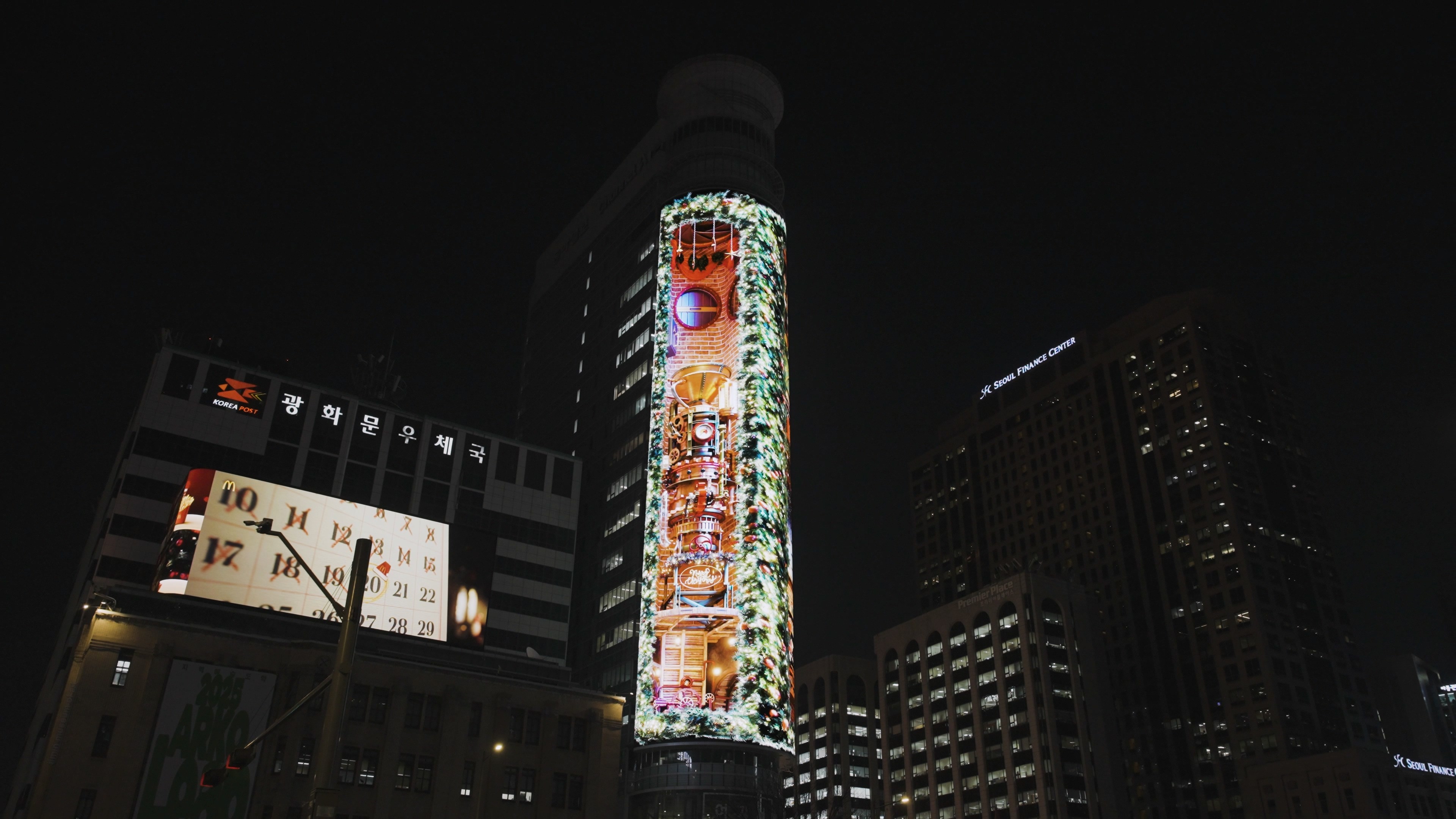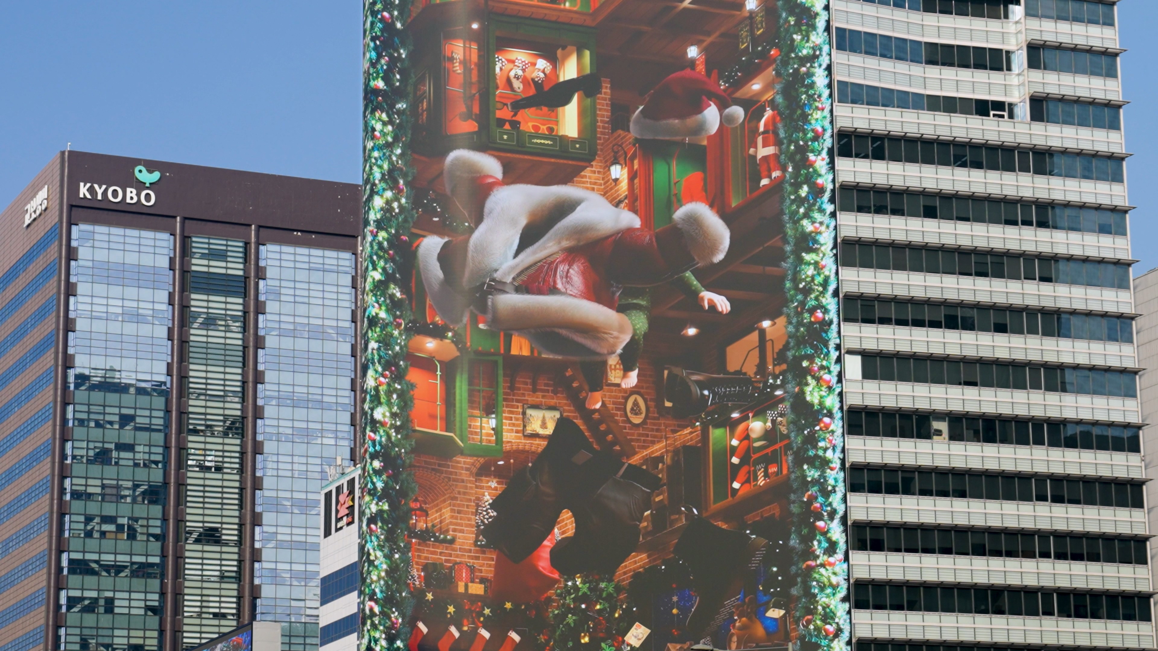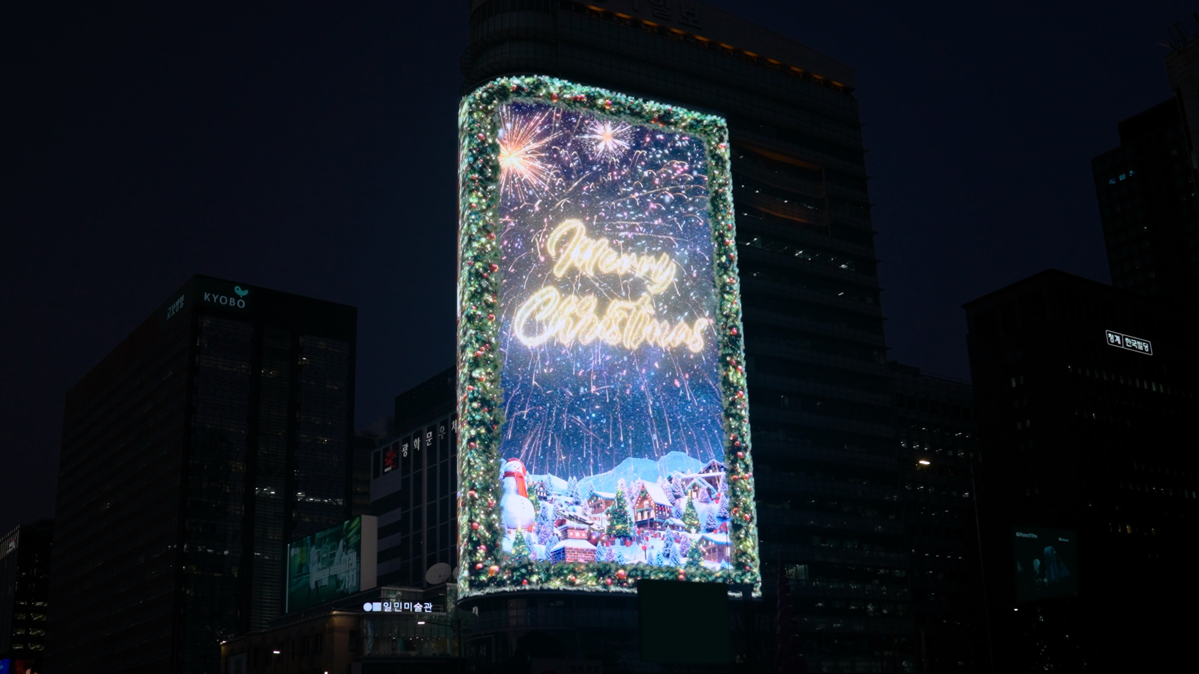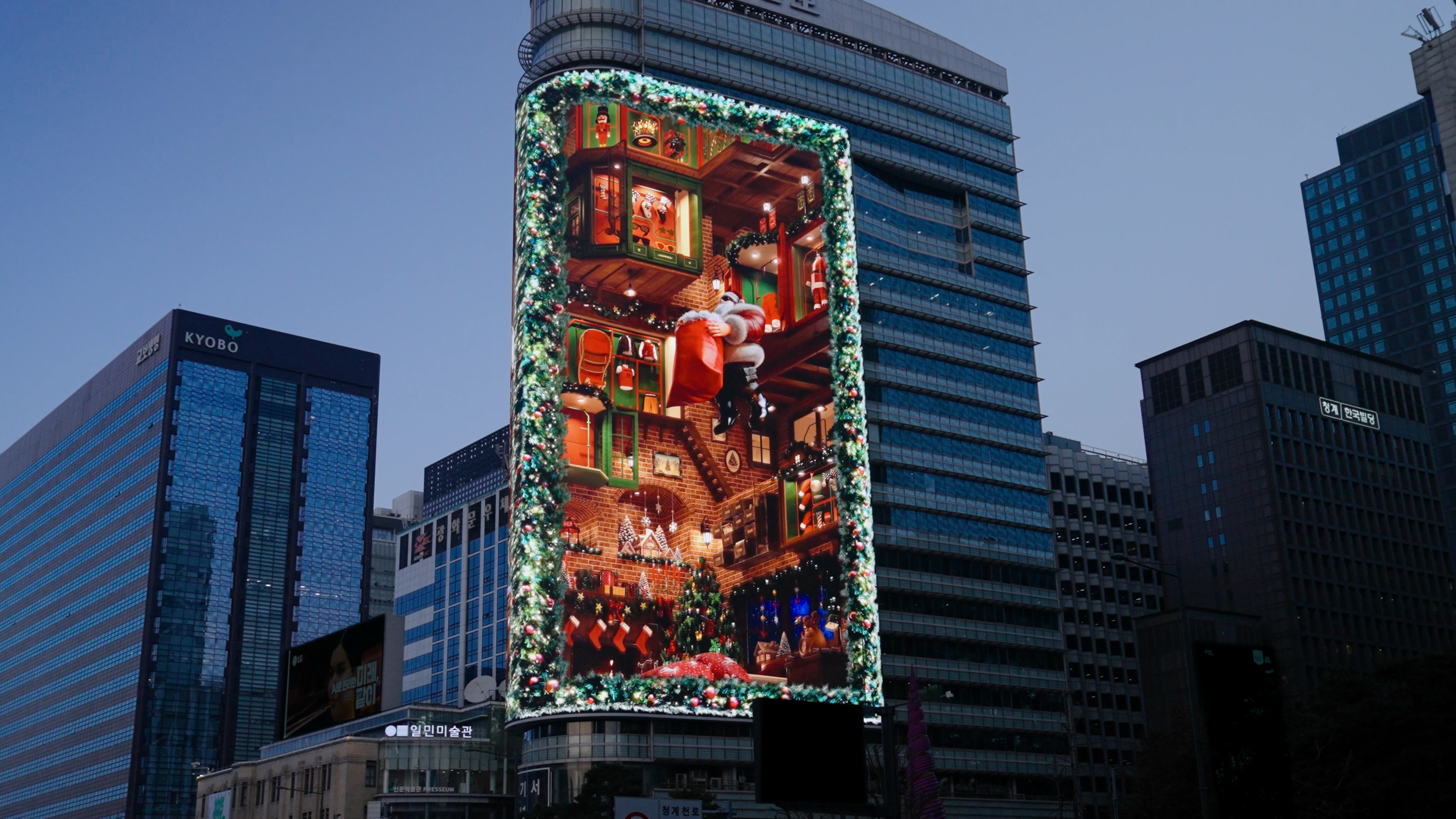 Additionally, by utilizing the curved structure of the media facade, the main display presents Santa’s commute, while a separate side display on the rear loops the process of gifts being wrapped—connecting seamlessly to Santa’s world. Through this dual-screen composition, the entire building is transformed into a stage, expanding the narrative universe and creating an immersive storytelling experience.